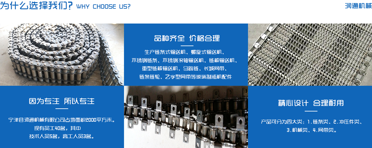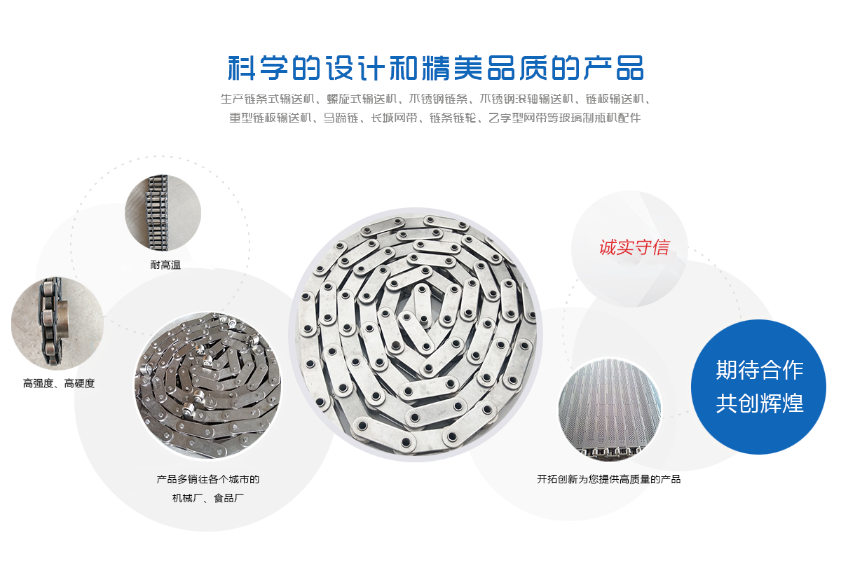 生產(chǎn)鏈條式輸送機(jī)、螺旋式輸送機(jī)、不銹鋼鏈條、不銹鋼滾軸輸送機(jī)、鏈板輸送機(jī)、重型鏈板輸送機(jī)、馬蹄鏈、長(zhǎng)城網(wǎng)帶、鏈條鏈輪、乙字型網(wǎng)帶等玻璃制瓶機(jī)配件,食品機(jī)械配件及各種網(wǎng)帶的專(zhuān)業(yè)廠(chǎng)家 ,多年來(lái)產(chǎn)品暢銷(xiāo)各地玻璃廠(chǎng)和食品廠(chǎng),在玻璃制品等行業(yè)中享有較高的聲譽(yù)。公司集摸具開(kāi)發(fā)、機(jī)械設(shè)計(jì)生產(chǎn),銷(xiāo)售于一體的生產(chǎn)型企業(yè)。生產(chǎn)的自動(dòng)化流水線(xiàn)金屬傳動(dòng)網(wǎng)帶、鏈條等產(chǎn)品廣泛用于玻璃機(jī)械、食品機(jī)械、化纖機(jī)械、醫(yī)藥、電子、烘干機(jī)械、輪胎機(jī)械等行業(yè)。產(chǎn)品多銷(xiāo)往各個(gè)城市的機(jī)械廠(chǎng)、食品廠(chǎng)和一些涉及流水線(xiàn)或自動(dòng)化設(shè)備的公司。